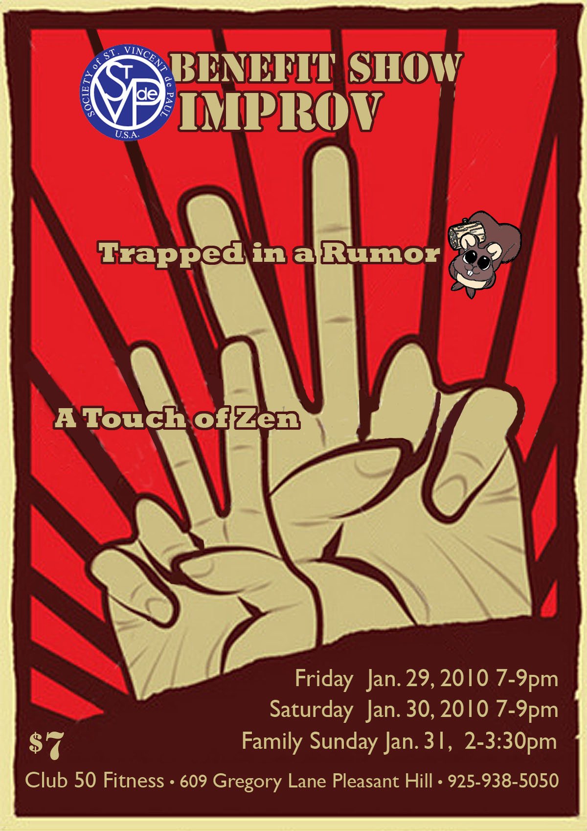 Trapped In A Rumor will be helping out by putting on a show. More details to come, but there will be at least two improv troupes! Tickets will be $7 and we’re limited to about 50 seats, with 100% going to the cause! If you’re interested tickets may be ordered in advance by calling Club 50 Fitness. Let them know you’re interested in tickets for the St. Vincent de Paul benefit sow. (925) 938-5050